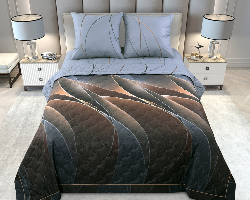 Уникальность комплекта для сна заключается в том, что вместо традиционного пододеяльника и наволочек в комплект входит тонкое стеганое одеяло, выполненное из ткани того же дизайна, что и основной комплект.